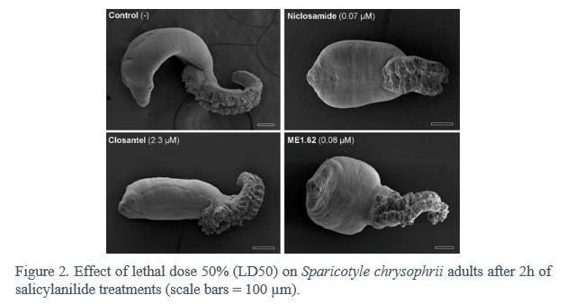 The primary MOA of this chemical family is related to uncoupling of the mitochondrial oxidative phosphorylation and eventually disturbing ATP production. Based on this, morphological analysis of exposed worms revealed an antero-posterior body contraction for the three most effective salicylanilides tested. Examination by SEM evidenced that the severe body contraction affected the surface of the parasites’ tegument, compared to control untreated worms. The tegument formed deep transverse folds and ridges in all parasites exposed to the treatments. The parasite’s haptor, the organ for attachment to the gill filaments provided with two rows of clamps, was also severely affected by the drug treatments. Muscle contraction provoked clamp opening after treatment with closantel and ME1.62 , whereas niclosamide induced clamp opening accompanied by the retraction of the clamps within their tegumental sheaths. Additionally , it caused erosive damage in some tegument areas (Figure 2).