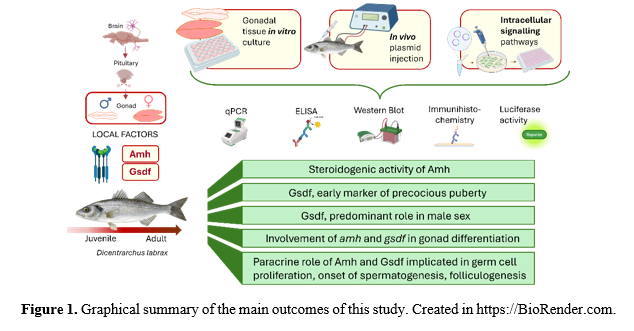 Effective control of reproduction is fundamental for sustainable aquaculture of farmed species, and understanding in-depth the molecular regulatory systems governing gametogenesis becomes essential. In vertebrates, t he brain-pituitary-gonad (BPG) axis regulates reproduction though gonadotropins, sex steroids, and local gonadal factors , t he latter being largely unknown in fish. Among these, some members of the transforming growth factor β (TGF-β ) family, including the Anti-Müllerian Hormone (Amh) and the Gonadal Soma-Derived Factor (Gsdf), are emerging as key regulators of early stages of gametogenesis and sex determination and differentiation [1] . To date, t heir characterization links them to male sex differentiation [2,3] and to the proliferation of type A spermatogonia (SgA) [4,5] , while their regulatory roles in male and female adult gonads remains to be clarified . The European sea bass (Dicentrarchus labrax), an economically important species in Mediterranean aquaculture, provides a robust experimental model for this research based on the good number of tools available for reproductive physiology studies . Based on our previous knowledge and developed tools (sea bass recombinant proteins and specific antibodies) [6,7], t he aim of this work is the functional characterization of Amh and Gsdf in male and female sea bass during puberty and adult gametogenesis.