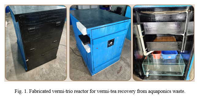 The vermi-trio reactor was conceptualized focusing on a vertically stacked tray design to conserve space and enhance process efficiency. The structure was fabricated using durable wooden trays, selected for their cost-effectiveness and structural stability. To improve resistance against decomposition during composting, each tray was coated with two layers of plastic-based paint. The reactor accommodates the efficient transformation of fish sludge and plant waste into biofertilizers through vermicomposting. To ensure optimal functioning, the system is operated under controlled conditions suitable for Eisenia fetida, the earthworm species used for decomposition. An automated sensor system monitors and regulates environmental conditions, maintaining a temperature of 25–30°C and relative humidity of 50–70%, which are critical for efficient microbial activity and earthworm performance.