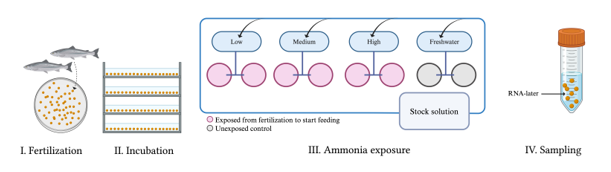 An ammonia exposure trial was conducted by fertilising a batch of Atlantic salmon eggs followed by the exposure to three levels of ammonia (low: 22 µg/L, medium: 75 µg/L, and high: 148 µg/L ) until the stage prior to start feeding (976 DD). Samples were taken from six developmental timepoints for mRNA expression analysis of important genes responsible for ammonia transport, urea excretion and cellular stress response . The spatial localization of ammonia transporters was also examined at two key developmental stages: hatching (525 DD) and near complete yolk absorption (900 DD), using immunohistochemistry.