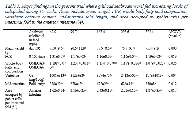 A total of 600 seabream juveniles (12.8 ± 1.5 g) were divided into five dietary groups with increasing levels of calcifediol: <2.0 (control), 99.7, 167.4, 298.6, and 825.4 ppb. All diets included 3000 IU/kg of vitamin D3. The fish were reared for 15 weeks under controlled conditions and fed three times daily. Parameters measured included growth performance, feed conversion ratio (FCR), specific growth rate (SGR), biochemical composition, vitamin and mineral content, skeletal anomalies (via X-ray), and intestinal histology among others. Statistical analyses included ANOVA and regression models to determine significance (p<0.05).