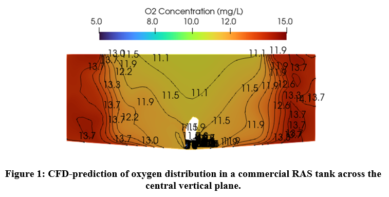 This study highlights the role of DO distribution and water quality management in RAS. The model-visualizes and analyzes how oxygen is distributed in a commercial RAS tank under typical operating conditions, also accounting for the impact of the fish itself . The model accounts for stocking density, fish oxygen consumption and fish distribution, and shows how variations in water flow influence s the oxygen availability in different parts of the tank. Figure 1 shows the model prediction of DO distribution across the central vertical plane for a salmon stocking density of 64 kg/m3. By simulating various conditions such as biomass densities, oxygenated water inlet placements, and waste accumulation patterns, it is possible to identif y practical strategies to reduce oxygen gradients and promote more uniform conditions throughout the tank. These include optimizing the placement of oxygen delivery systems, improving tank flow design, and regularly removing biosolids to prevent stagnation.