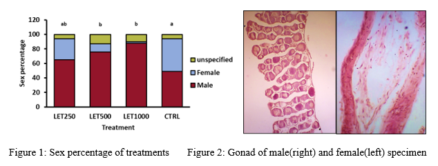 The results of sex determination indicated that the highest rate of masculinization was achieved for treatments LET1000 and LET500, with 88 and 83 percent male fish, respectively.