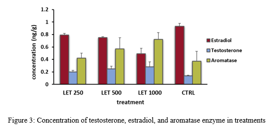 The highest level of estradiol was observed in CTRL on day 80 and the lowest level was measured in treatment LET1000 . The concentration of testosterone in treatment LET1000 was higher than in other treatments and the concentration of aromatase enzyme in all experimental treatments was higher than control, with the highest amount in LET1000.