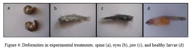 Treatment LET1000 exhibited the highest deformity among the experimental treatments; however, this rate was not significantly different from that of the control group (P ≥ 0.05). Specifically, the rate of deformity in treatment LET250 was 5.2% (78 malformed larvae), in treatment LET500 it was 4% (60 malformed larvae), in treatment LET1000 it was 6.46% (97 malformed larvae), and in the control group (CTRL) it was 4.8% (72 malformed larvae).