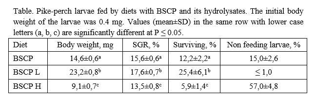 It is clear that BSCP L has a positive effect on the growth, survival and feeding of pike- perch larvae, due to an increase in the amount of low-molecular-weight peptides (compared to intact BSCP) available for absorption by larvae whose digestive system is immature. On the other hand, BSCP H leads to a sharp increase in the proportion of peptides and amino acids, which has a negative effect on the fish rearing.