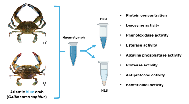 Despite their economic significance, brachyurans are relatively understudied among invertebrate groups compared to other decapods, with numerous fields remaining to be explored, including the immune response. Therefore, the aim of this study was to characterize several immune-related enzymes and activities of the Atlantic blue crab (Callinectes sapidus) in cell-free haemolymph (CFH) and in the haemocyte lysate supernatant (HLS), considering the gender factor and the suitability of measuring each activity in CFH or HLS. Data were expressed by millilitres of haemolymph or milligrams of protein to identify which of these units would be more robust and informative. For this, haemolymph from crabs of each gender was collected, and centrifuged to obtain CFH samples, whilst the cells were sonicated to get the HLS. Our results revealed that the protein concentration was higher in CFH compared to HLS. Considering milligrams of protein as units, phenoloxidase and esterase activities were lower in CFH regarding to HLS in both genders. Similarly, the lysozyme and phosphatase activities were lower in CFH compared to HLS but only in females. The values of lysozyme activity were higher in HLS of females compared to males. Studying millilitre of haemolymph as units, lysozyme activity exhibited higher activity in CFH compared to HLS in both genders, whilst phenoloxidase and esterase activities were higher in HLS, showing variations only in males. Interestingly, alkaline phosphatase activity was undetected in CFH male. Any variation was observed between the activities measured in both genders. Protease and antiprotease activities were higher and lower in CFH compared to HLS values, respectively, whilst any variation was observed between genders. Bactericidal activity against V. harveyi , V. alginolyticus and V. anguillarum, exhibited stronger values in HLS than in CFH, independently of gender, as well as against P. damselae in females. Considering gender factor, the bactericidal activity against V. alginolyticus, V. anguillarum and P. damselae was higher in HLS of females than in males. However, the bactericidal activity against V. alginolyticus and P. damselae was higher in CFH of males compared to females. Our results could contribute to gender selection in future brachyurans studies considering the variability between males and females due to their distinct biology. Additionally, we provide data regarding the baseline values of several immune-related activities, establishing the most appropriate units from the biological point of view.