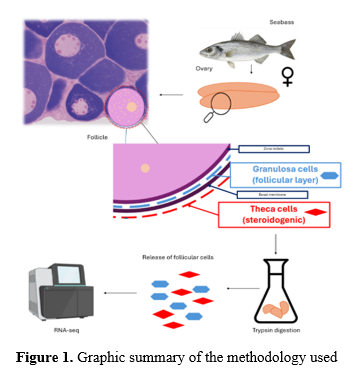 Follicular cells were isolated throughout the annual cycle from ovaries of adult females kept under natural photoperiod and temperature at the Instituto de Acuicultura Torre de la Sal (IATS), following Crespo et al. (5). Ovaries were dissected, washed, and dissociated in M199:H₂O medium with antibiotics. Enzymatic digestion was performed with trypsin (37 °C, 30 min), followed by filtration (100 μm), centrifugation, and resuspension in M199 Hanks medium. Follicular cells were counted using Trypan blue in a Neubauer chamber. RNA was extracted with the Maxwell® LEV simplyRNA Tissue kit, and quality was assessed with Nanodrop® and Bioanalyzer. Libraries were prepared and sequenced (Illumina NovaSeq X) by BMKgene.
