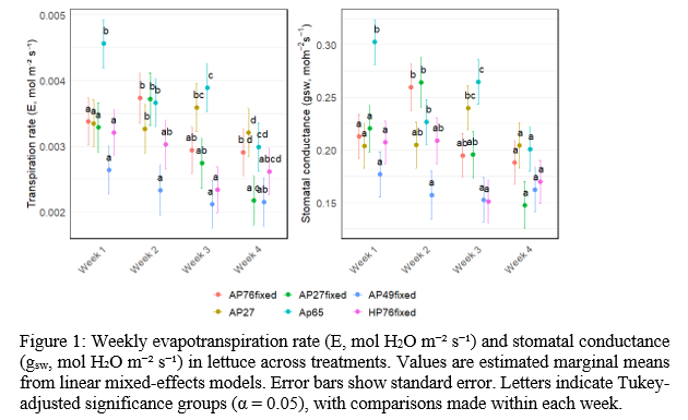 Significant effects of treatment and time were observed on evapo transpiration rate and stomatal conductance, with notable treatment × week interactions. The AP49 treatment exhibited higher E and gsw at week 1 compared to other treatments, indicating increased physiological activity under moderate nutrient levels without EC control. However, these values declined during weeks 2 and 4, coinciding with periods between nutrient applications and suggesting transient nutrient stress. In contrast, the AP49fixed treatment showed consistently lower E and gsw, reflecting reduced physiological flexibility under fixed EC conditions (Figure 1) . Despite these fluctuations, AP49 maintained high biomass accumulation by week 4, with significantly higher fresh weight (358.97 g ± SE 22.57) than AP76fixed (p = 0.0188), AP27fixed (p = 0.0007), and AP27 (p = 0.0025), indicating efficient resource use and partial decoupling of water-use traits from growth.