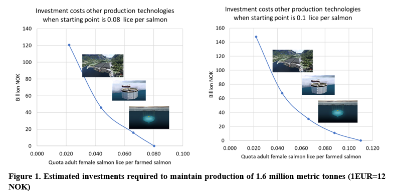 The dominant conventional open cage farm technology allows sea lice to migrate in and out of farms. This paper analyzes what levels of investments are necessary in alternative ‘low lice’ and ‘zero lice’ production systems to satisfy lice quotas. For each possible sea lice quota level we estimate the production technology combinations of (1) ‘low lice’ deep sea cages, (2) ‘zero lice’ sea based closed containment systems and (3) land based closed systems that can satisfy the quota with the highest net present value (NPV). Investment cost per kg of salmon produced increases substantially from deep sea systems via closed containment to land based systems. Furthermore, the production share of each production technology is constrained by nature, government regulations, etc.