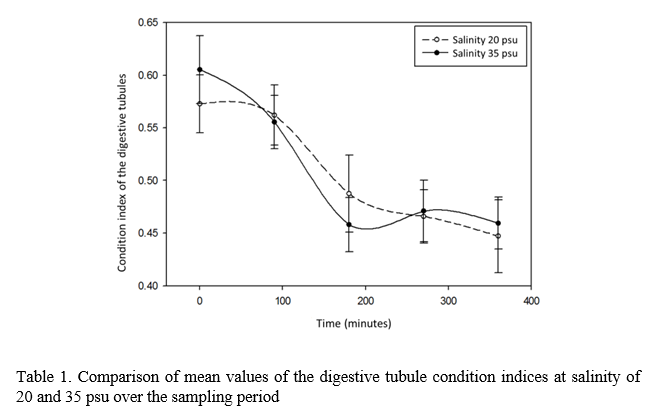 The results of a microscopic examination of the digestive gland of both groups have shown that there is a rhythmical exchange of phases in the digestive tubules (Table 1), where in a single oyster the exchange was not synchronous in all of the digestive tubules, but they were in phases that were close to one another. Depending on the sampling interval all four phases of digestive tubules were found: resting, absorption, degradation, and reconstitution. Within the same experimental group ANOVA test has shown a significant statistical difference between individual sampling intervals (p<0,05), which confirms the existence of a rhythmical exchange in the digestive rhythm in the tubules. The results of a statistical comparison using a CHI SQUARE test showed that there was no significant statistical difference in the values measured between the two salinity groups (χ²<0.711, p<0,05). Winstead (1995; 1998) found that lower salinity affects intercellular digestion in Crassostrea virginica. Horedesky et. al (2019) reported optimal salinity for Crassostrea gasar in the range of 4 to 40 psu. From our results it can be concluded that O. edulis can gradually adapt to a 20 psu salinity, with no significant changes in the feeding rhythm, digestion rhythm and the digestive tubules index regarding the tested salinity value.