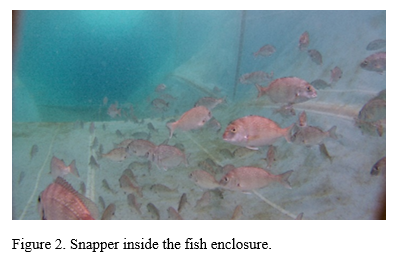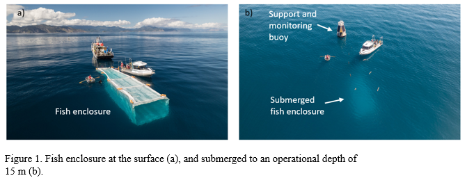 A 500m3 soft-engineered fish enclosure (20m x 5m x 5m) was constructed utilising a laminated ultra-high molecular weight polyurethane fabric with nets placed at the front and back of the enclosure (Figure 1).