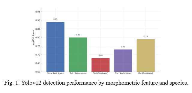 Overall, detection accuracy varied across species, morphometric traits but also from differences in image quality due variable environmental conditions. Red skin spots were the most accurately detected feature, while tail condition in European seabass showed the greatest need for further improvement. Both YOLO models performed reliably; YOLOv12 demonstrated advantages in computational efficiency. Future steps include to test the system on large scale aquaculture farms by estimating the percentage of damaged morphometric features.