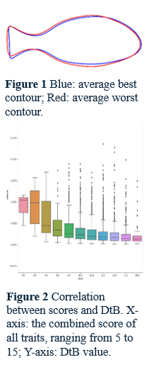 We evaluated the agreement between DtB and the original visual scores, with a particular focus on DtB . As shown in Figure 2, there was a general negative correlation between DtB and the manual scores, with a significant Pearson correlation of -0.12, indicating that higher-scoring fish tended to be closer to the ideal contour , with a smaller DtB value.