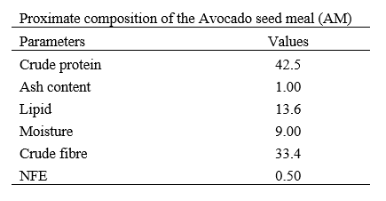 Avocado pear (Persea americana , Mill) is a widely consumed fruit because of its delicious tast e, rich nutrient composition and several-health promoting bioactive ingredients. It is rich in minerals, vitamins and protein. However, the seed which is discarded as a waste makes up between 15 and 17% of the whole fruit. Preliminary analysis of the seed used in the study showed high protein level of 42.5% which is closely related to the protein level of 45% in soybean meal. Hence the study investigated the effect of total replacement of soybean meal with the Avocado sees meal (AM) in the diets of African catfish. DL-methionine was added due to its limitations in plant protein feed ingredients.