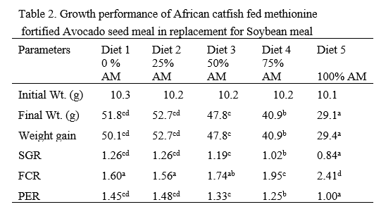 Five isonitrogenous diets were prepared to contain 0, 25, 50, 75, 100% of Avocado seed meal (AM) in replacement for soybean meal in making diets 1 -5. Then diets 1-5 were fortified with 0, 0.20, 0.40, 0.80, 1.0 % DL-Met respectively. The diets were fed to African catfish (10.2 g) for 56 days in indoor glass tanks. Standard procedures were used in data collection and analyses.