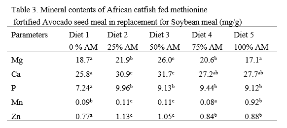 Replacement of soybean meal with A vocado seed meal at (50% +0.4% Met) is recommended for the production of African catfish. Replacement of soybean meal with AM also significantly improved the minerals and reduced the carcass glucose levels.