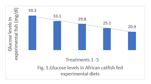 Analysis of the Avocado seed meal used in the study revealed a high protein content of 42.5% and high fibre and lipid contents (Table 1). Assessment of the mean weight gain, specific growth rate, feed conversion ratio and protein efficiency ratio indicated that AM can replace up to 50% of soybean meal in the diet of the fish (Table 2). Similarly, dietary AM significantly improved Mg , Ca, P, Mn and Zn deposition in the fish in comparison with the control diet containing 100% soybean meal (Table 3). Moreover, dietary AM significantly reduced the glucose levels in the experimental fish (Fig. 1).