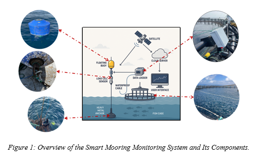 The load cell sensor i s deployed on offshore fish cage mooring lines to measure tension in real time. The sensor, securely anchored to the seabed, connects via a waterproof cable to a data logger housed on a floating buoy. Data collected by the sensor is transmitted through satellite communication to a cloud server, enabling remote access through a dedicated web interface. Figure 1 illustrates the physical components of the system, the data transmission flow, and includes photographs that depict the real deployment of the buoy, anchor, and sensors in the field.