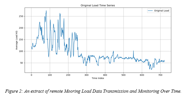 Figure 2 presents a time series of load measurements captured by the deployed monitoring system, specifically showing the tension exerted on the floating buoy anchoring point. These values, transmitted via satellite, reflect how the buoy responds to changing marine conditions such as waves, currents, and wind. Peak loads exceeding 250 kg were observed during periods of intense environmental activity, followed by a gradual decline and stabilization—likely indicating calmer sea states or repositioning of the buoy.